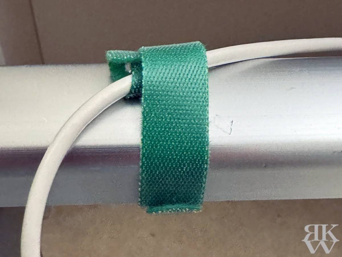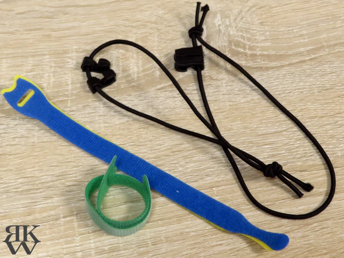 マジックテープの結束バンドと、小さいプラスチックのフックが付いたバンジーコードなら、柵の太さも関係なく使えますし、持ち込んだ電源ケーブルなども束ねられます。